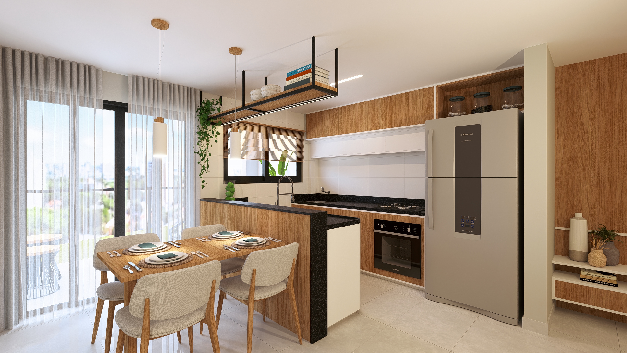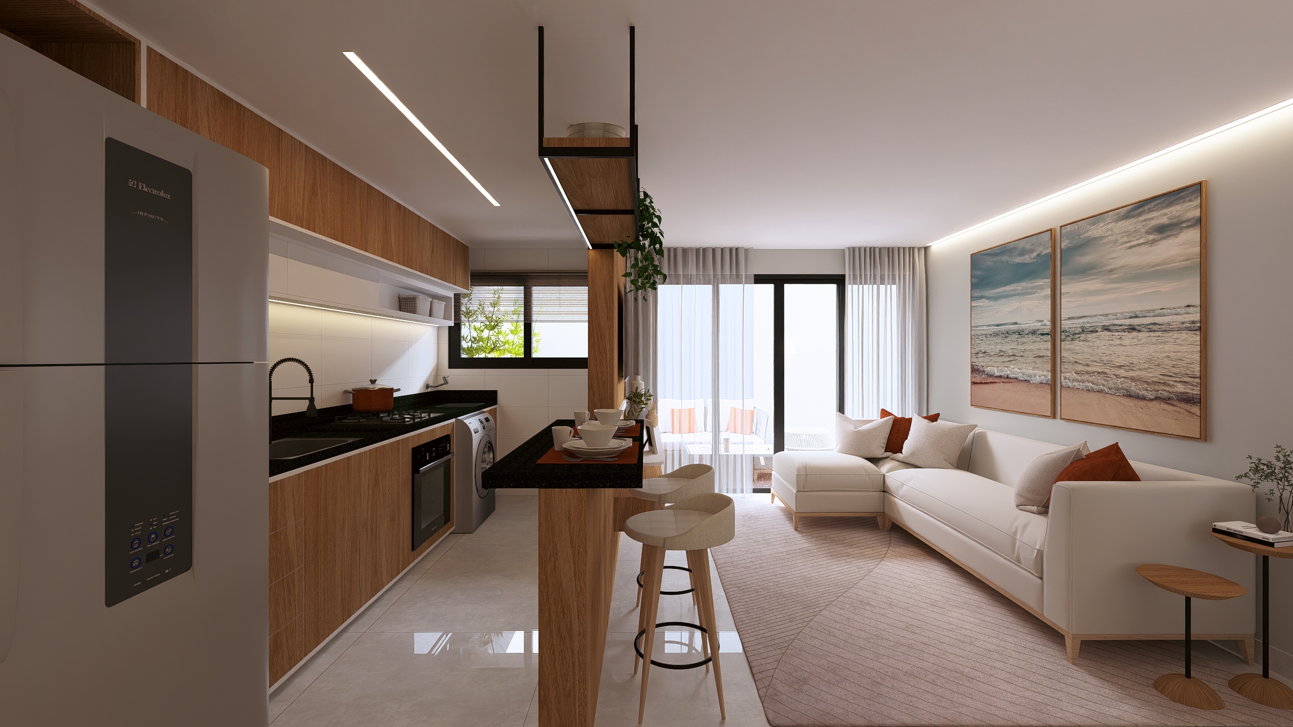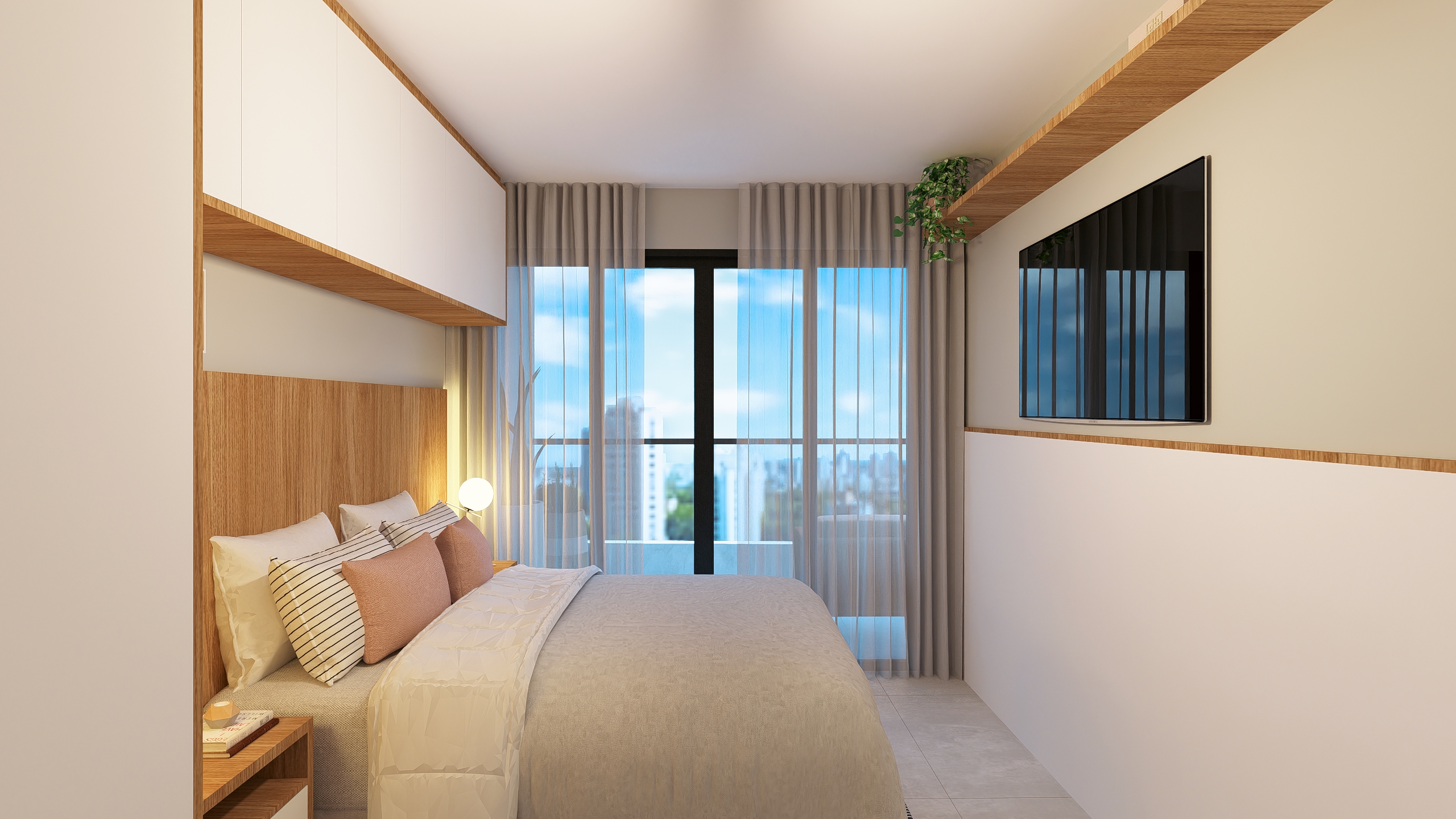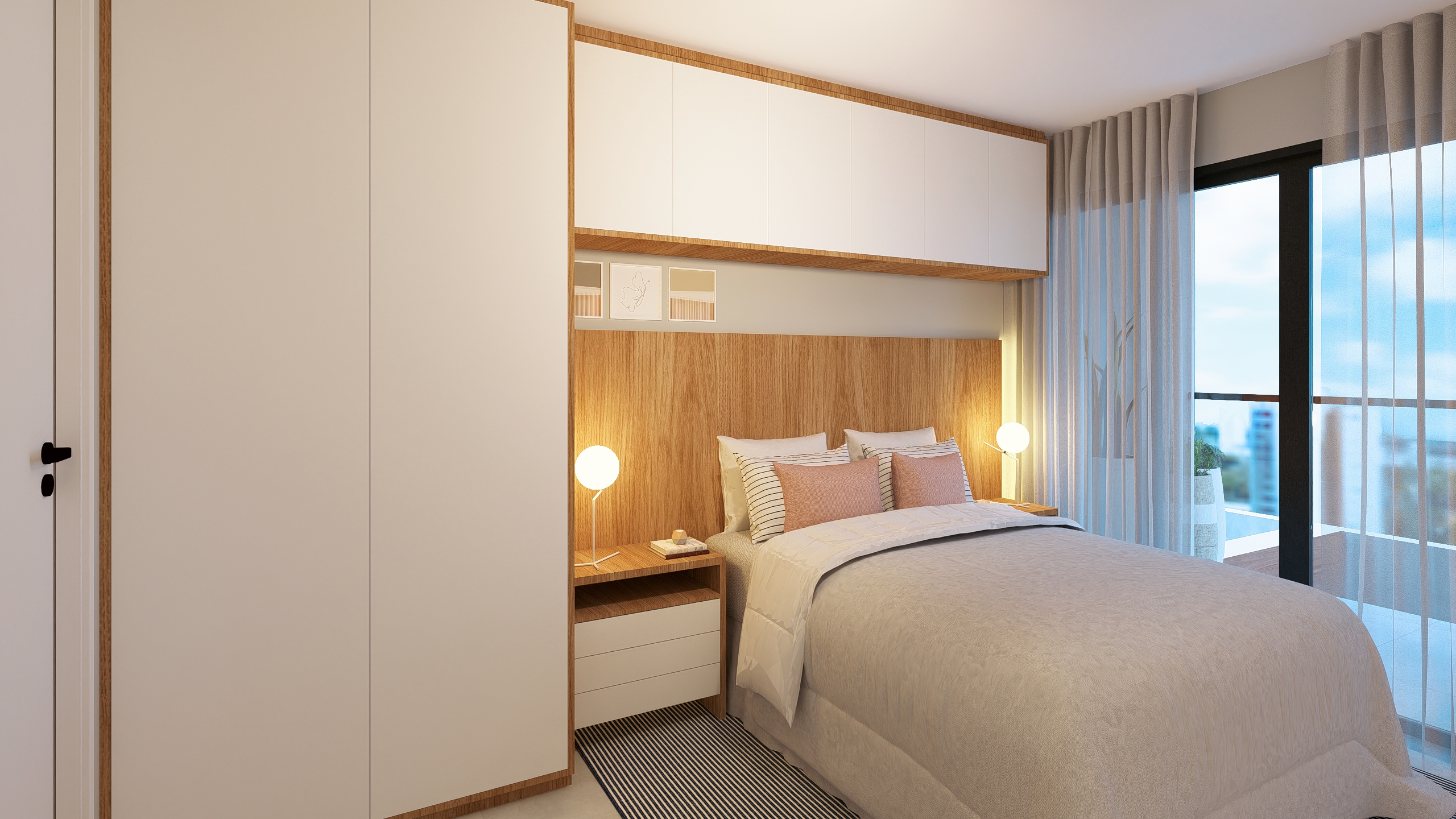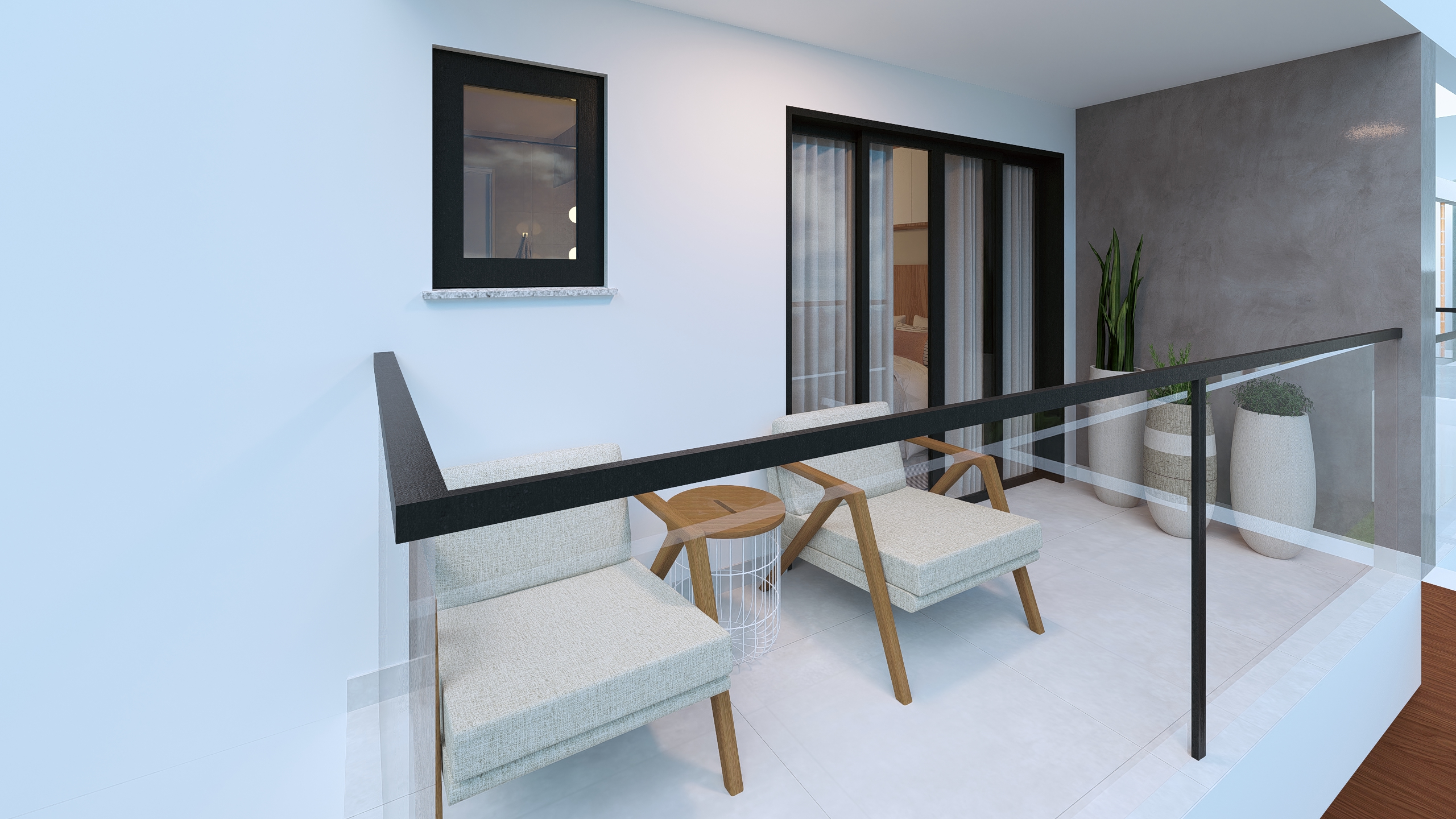 Nos andares superiores, estão distribuídas as unidades com varanda, projetadas com plantas funcionais que favorecem a ventilação natural e criam espaços mais iluminados e acolhedores.