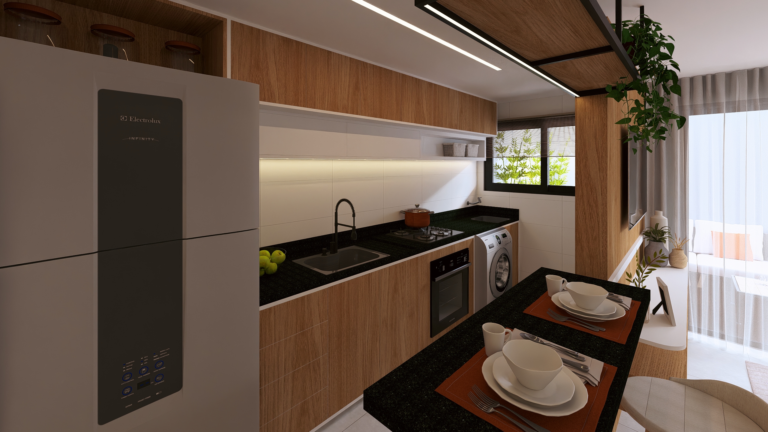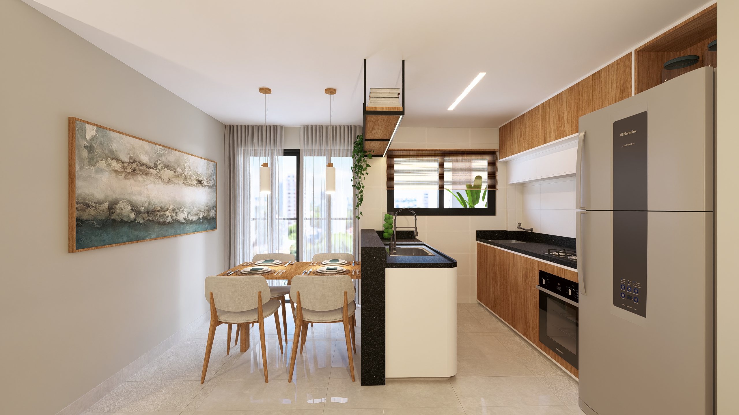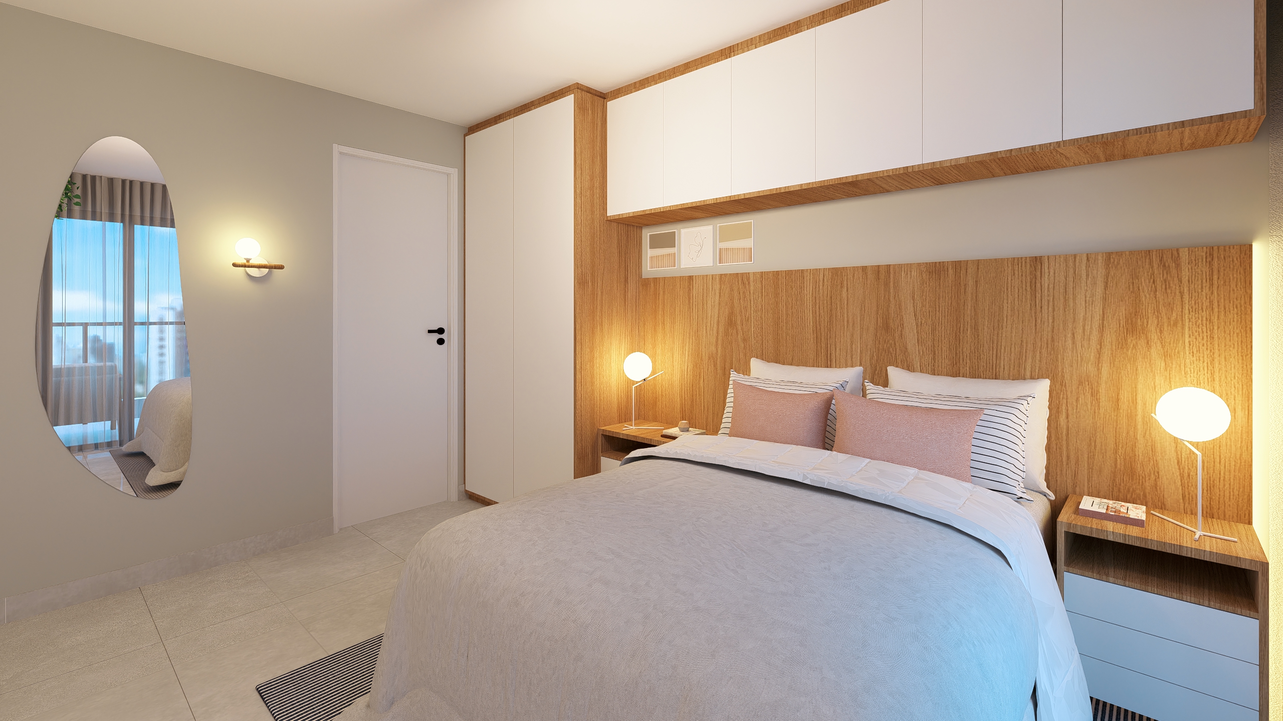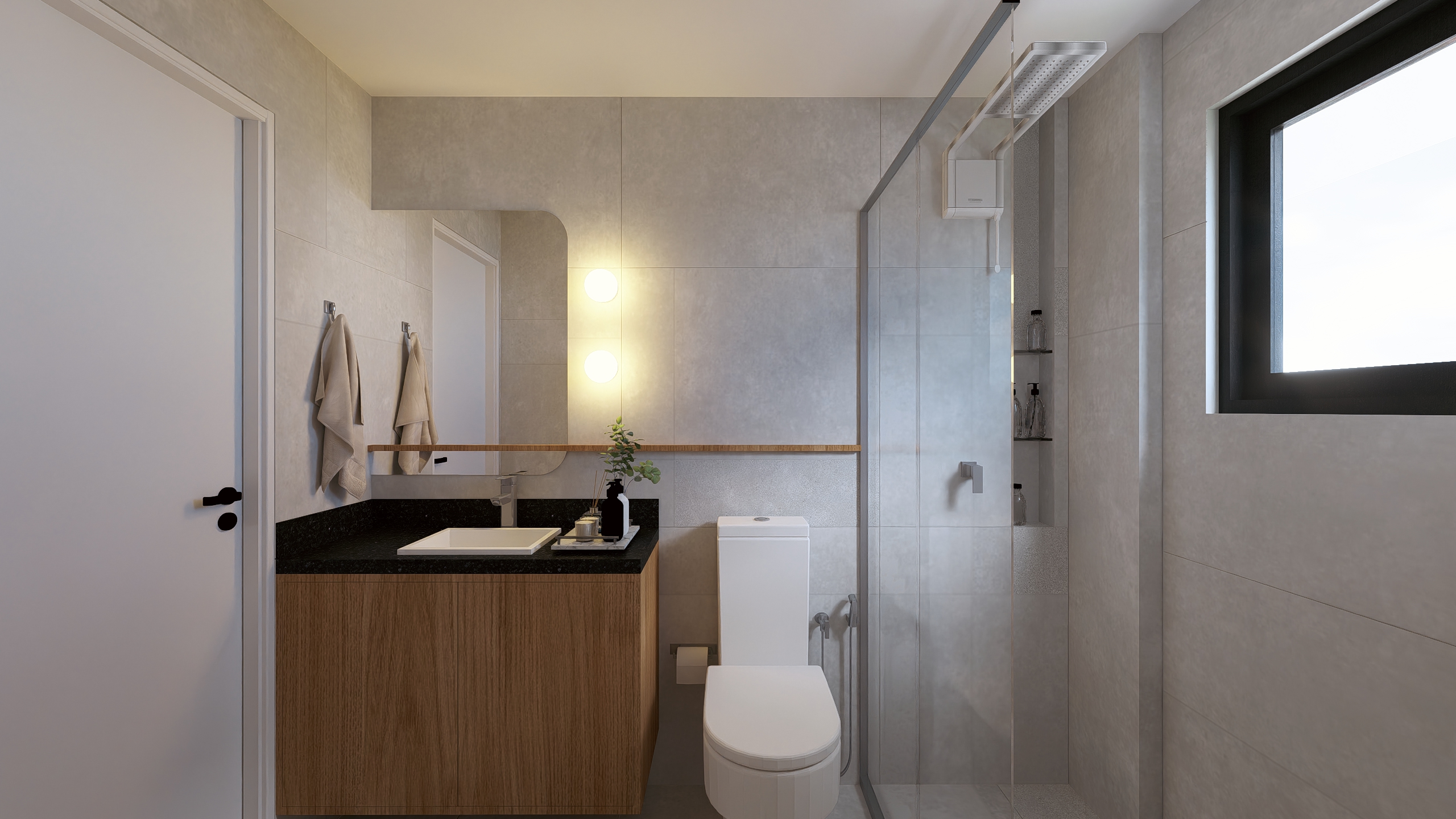 Nos andares superiores, estão distribuídas as unidades com varanda, projetadas com plantas funcionais que favorecem a ventilação natural e criam espaços mais iluminados e acolhedores.
