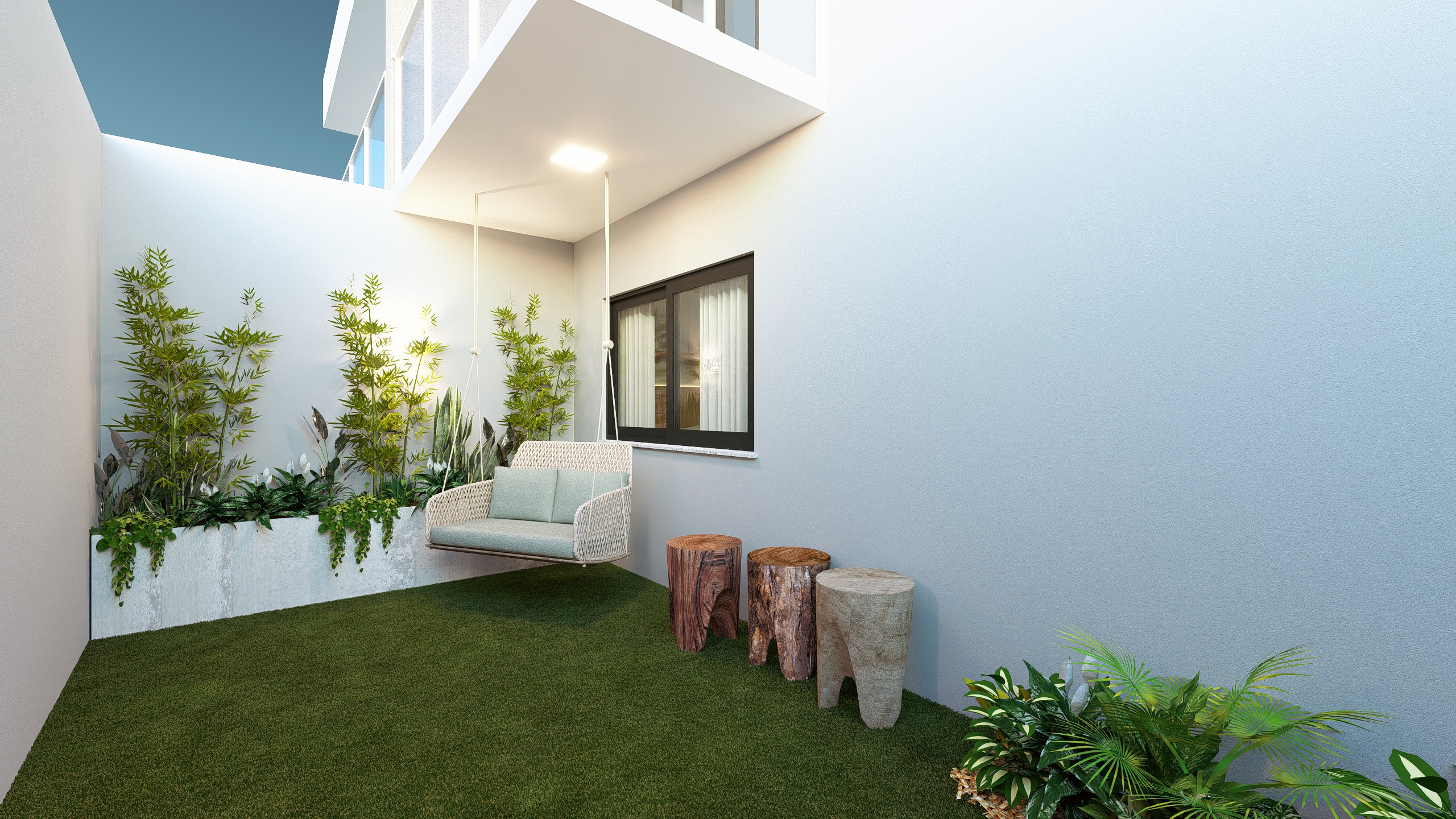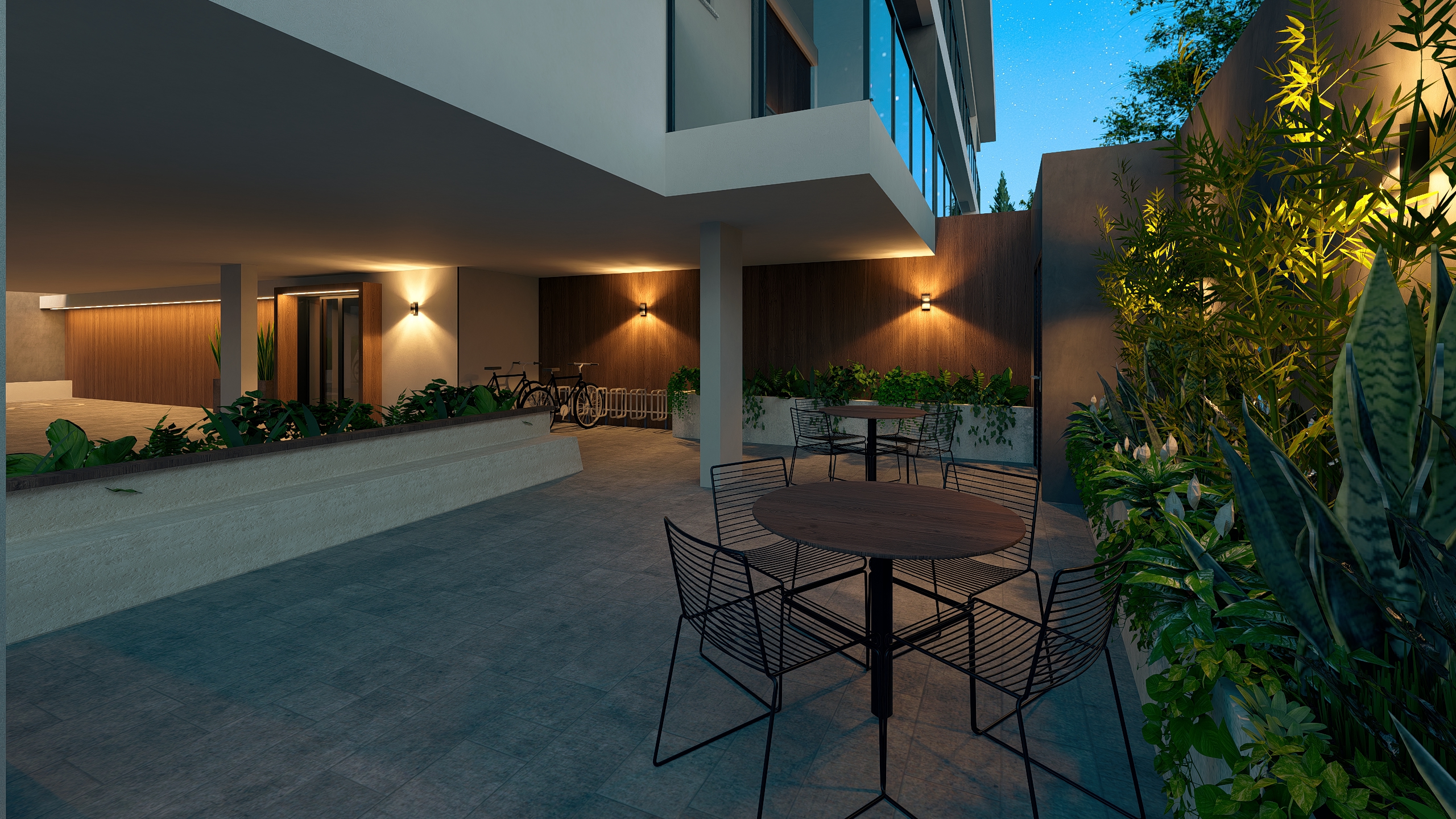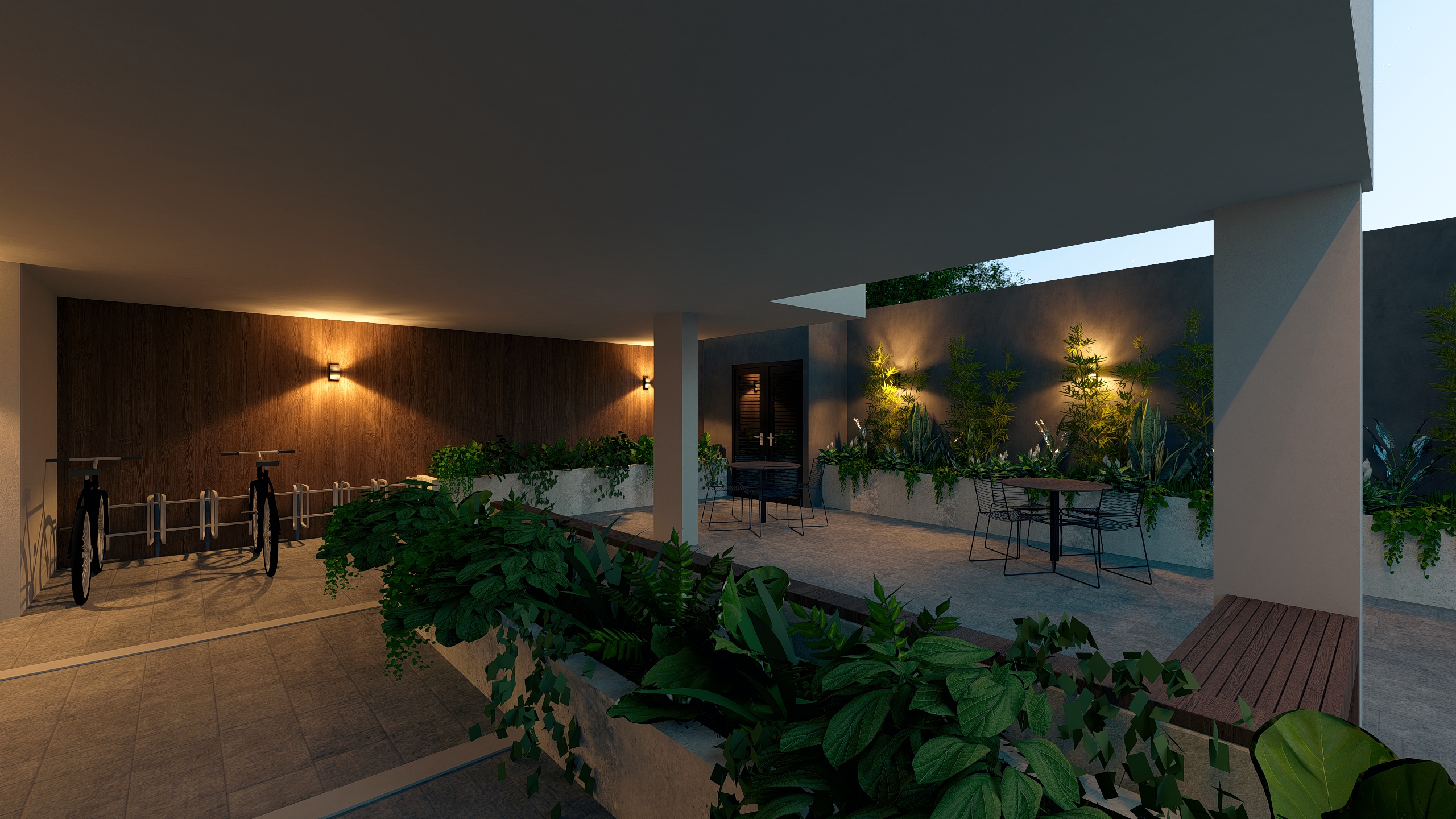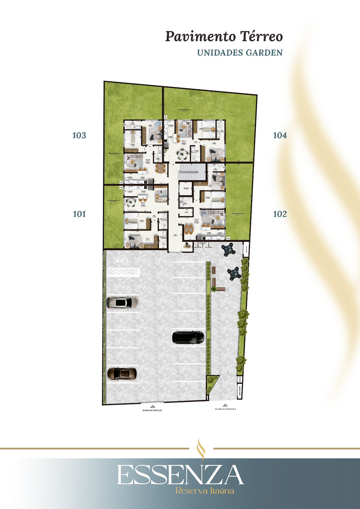 No térreo, encontram-se as unidades Garden, que contam com áreas privativas externas, perfeitas para quem gosta de integrar o interior com o exterior e aproveitar momentos ao ar livre com mais liberdade. Esse pavimento ainda dispõe de área de convivência, bicicletário e vagas de estacionamento, trazendo organização e praticidade ao dia a dia.