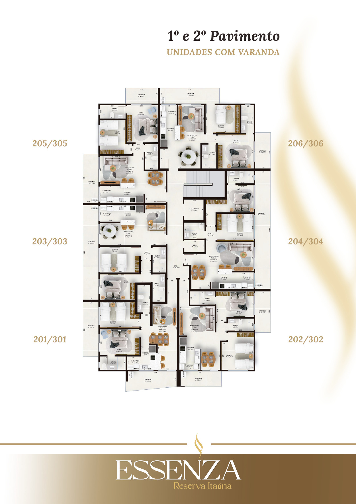 Composto por apenas 16 unidades residenciais, o Essenza oferece um ambiente reservado e acolhedor. São apartamentos distribuídos em pavimentos que valorizam a privacidade, a sofisticação e o bem-estar, em um endereço que combina serenidade e praticidade.