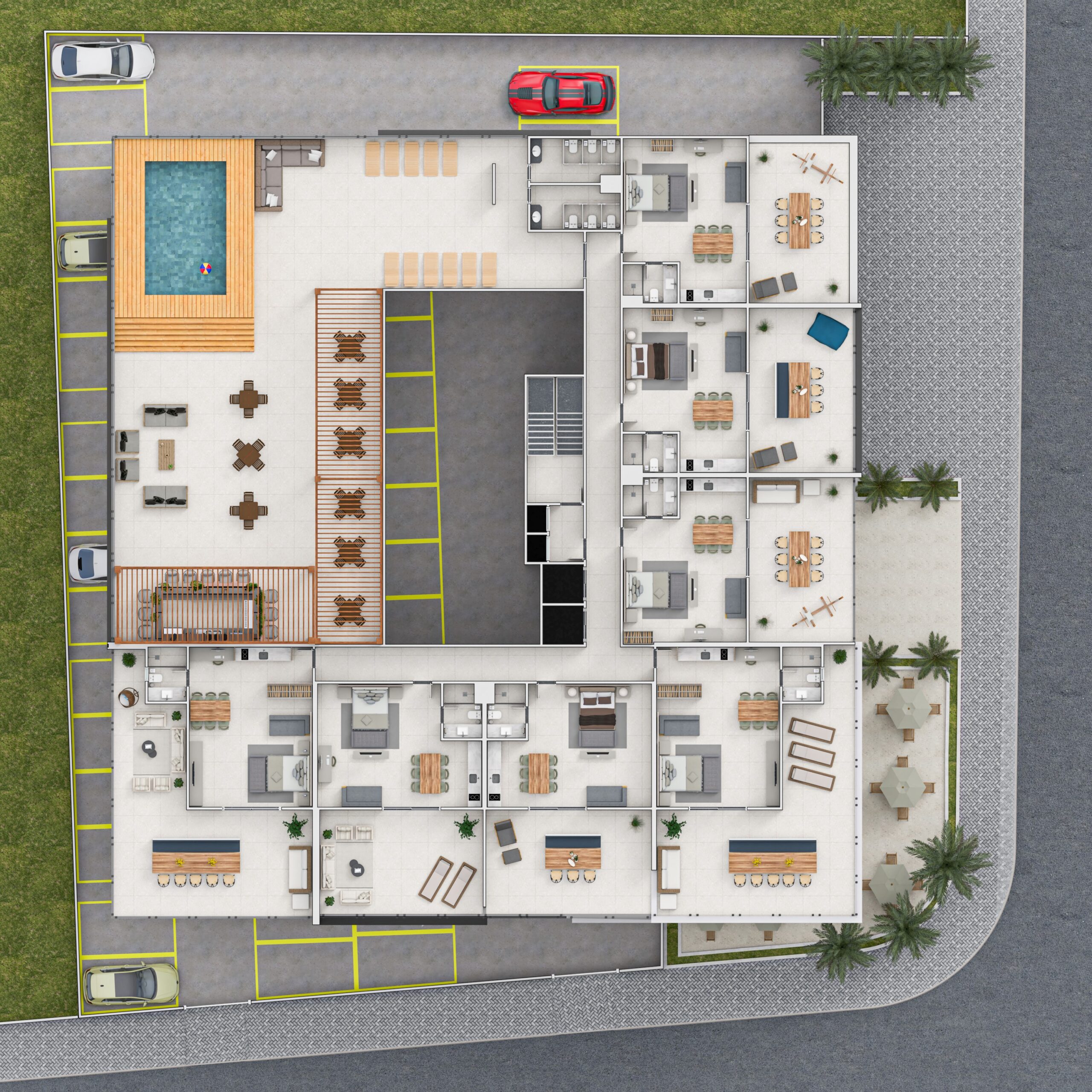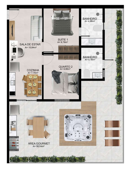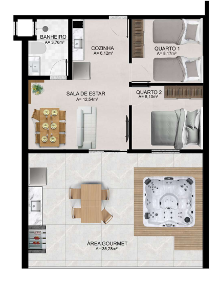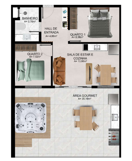 Já as unidades cobertura tem 2 quartos, sala, cozinha, banheiro e área gourmet com jacuzzi.