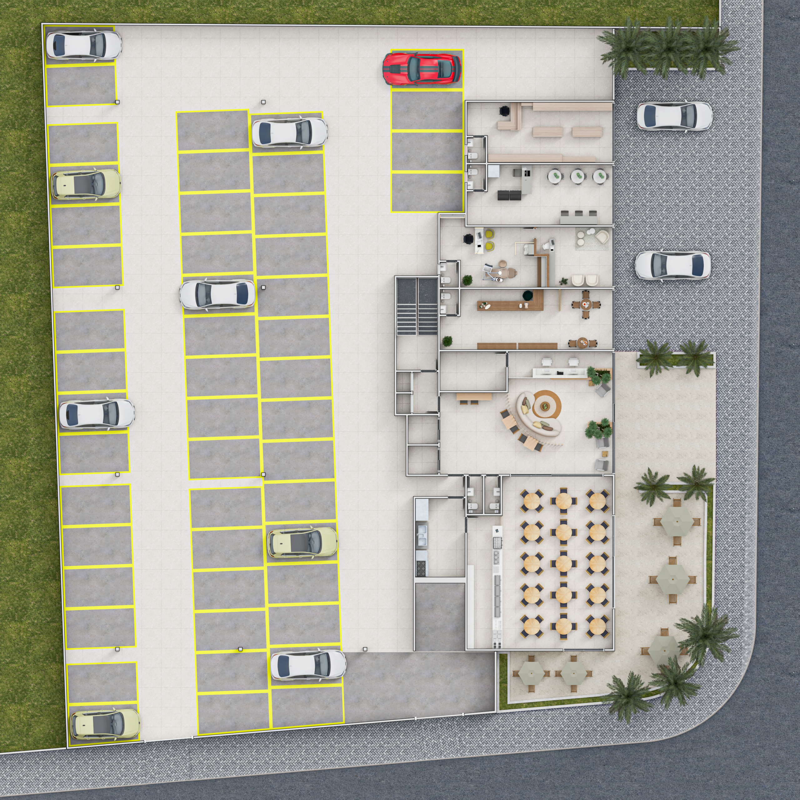No térreo encontra-se a recepção com lobby, o restaurante com a estrutura para café-da-manhã bem como refeições a lá carte ao longo do dia para hóspedes e público externo. Nesse andar também estão as vagas de estacionamento - cada unidade residencial tem 1 vaga em escritura privativa.