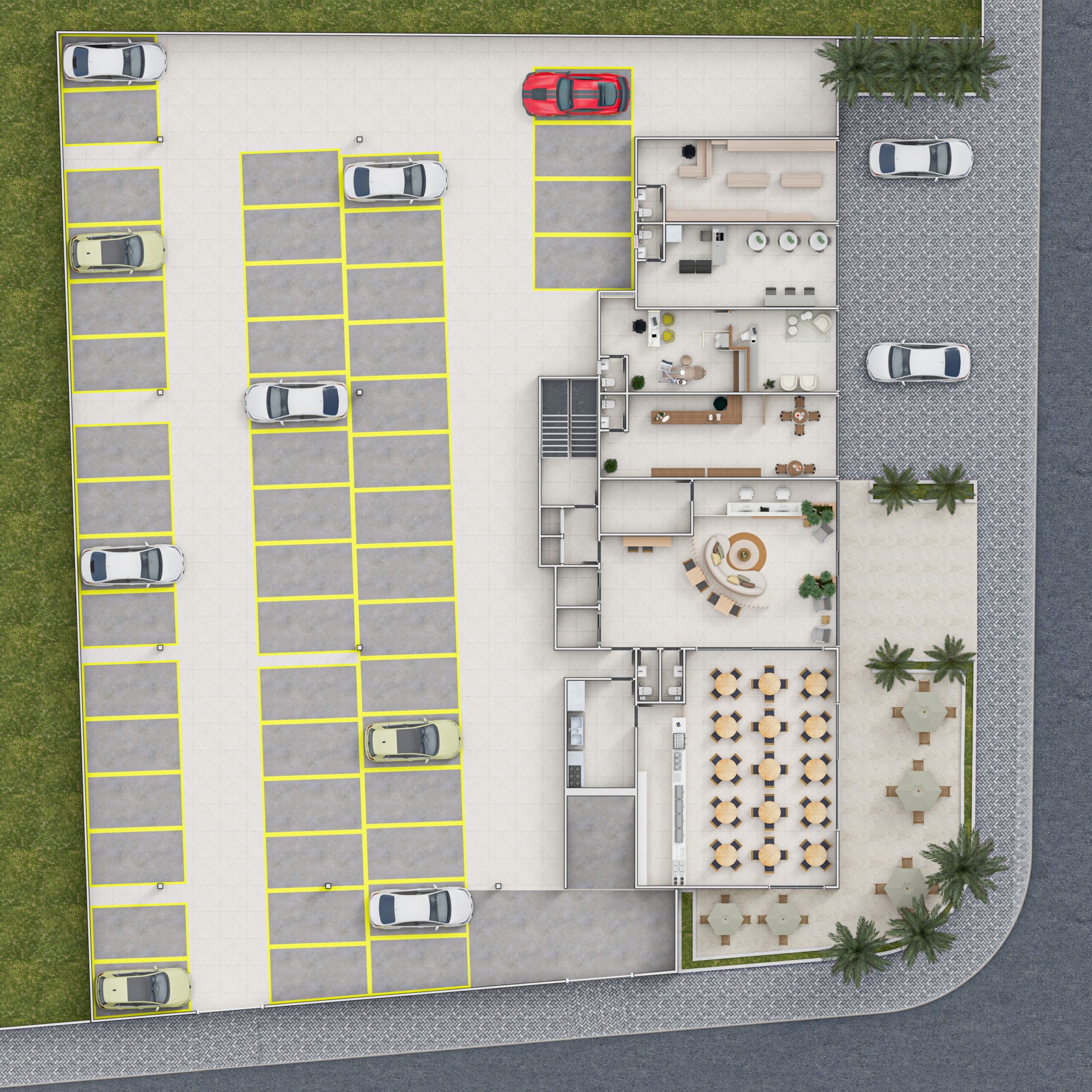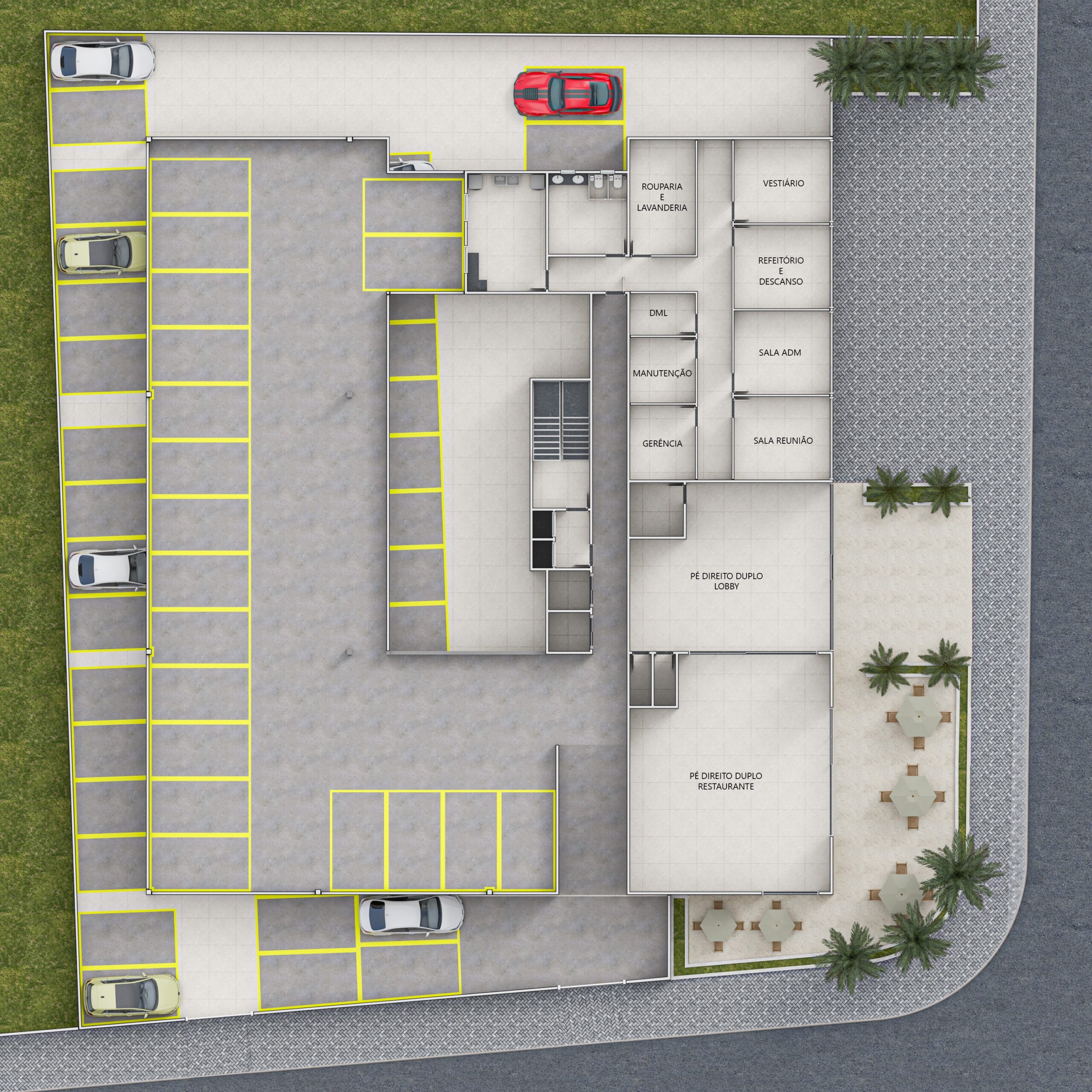 No mezanino temos vagas de garagem, a área administrativa e colaborativa bem como a lavanderia e vestiário do hotel. São mais de 150m² disponibilizados para a área comum do empreendimento.