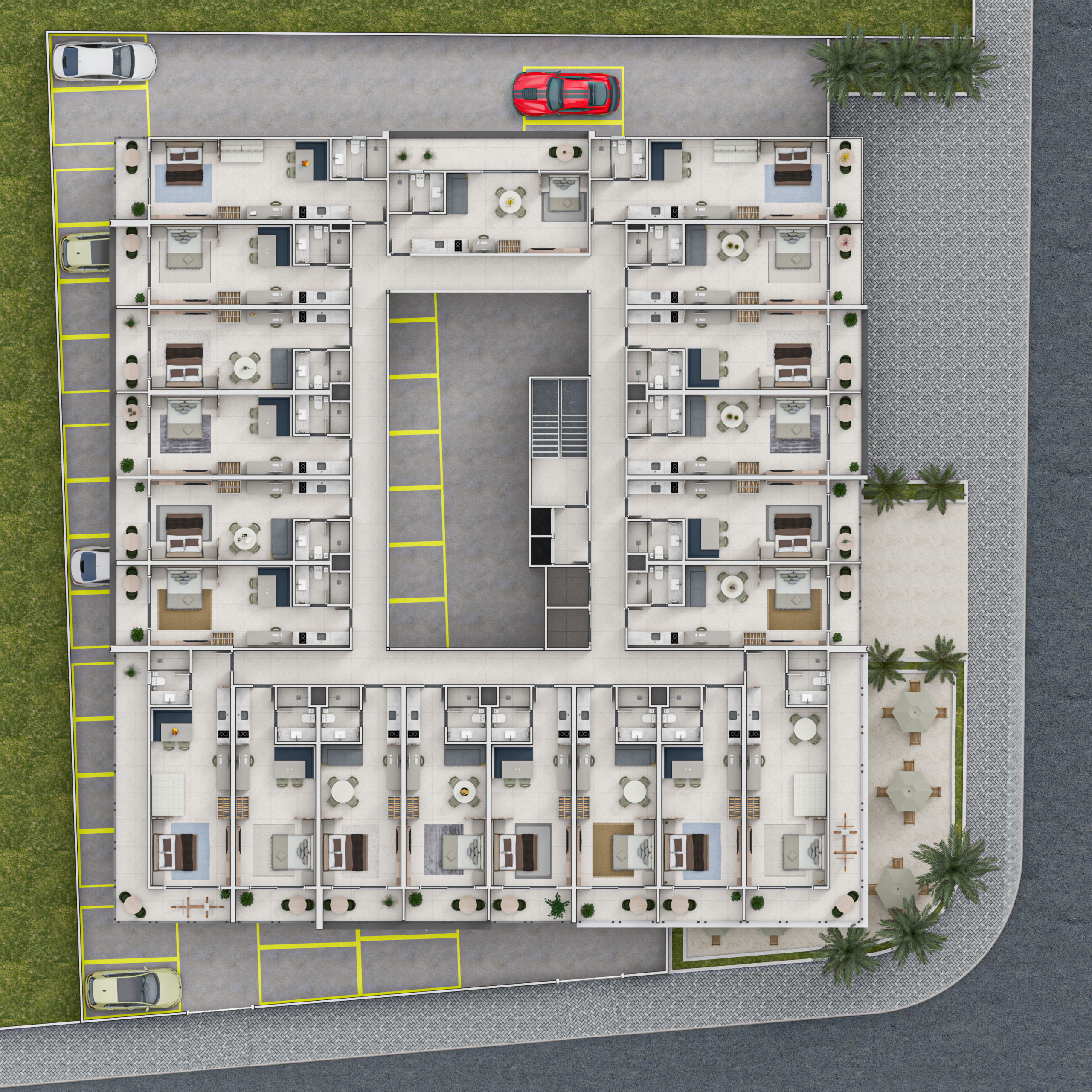 No 1º, 2º e 3º pavimentos temos as unidades tipo apartamentos, são 21 unidades por andar, com corredor circular que facilita locomoção e acesso aos elevadores e escada.